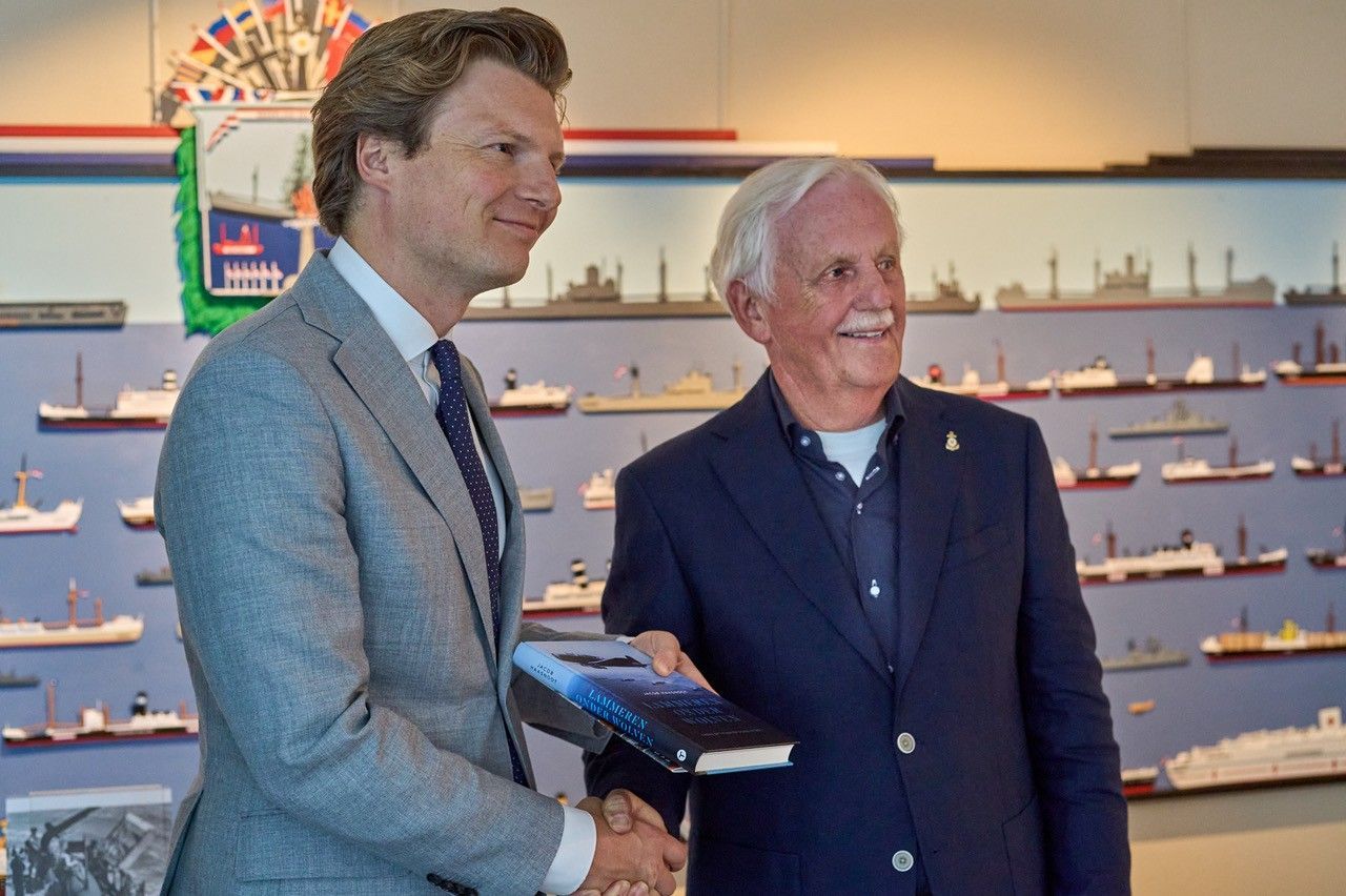 Auteur Jacob Haasnoot overhandigde op 15 augustus 2025 zijn boek ‘Lammeren onder wolven’ over de cruciale rol van de koopvaardij in WOII aan minister Ruben Brekelmans van Defensie op de expositie ‘Varen voor Vrijheid’ in het Katwijks Museum.